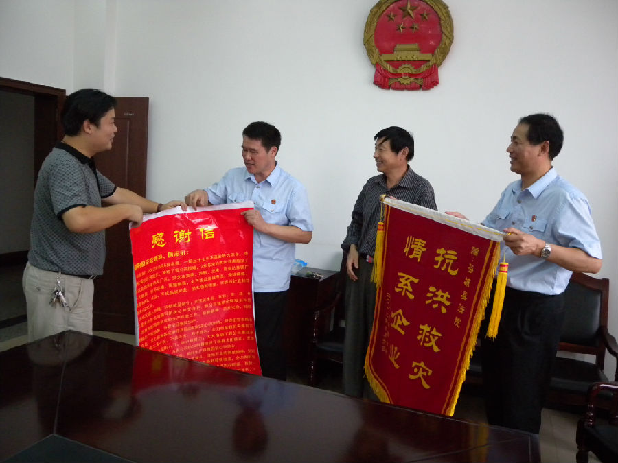 2012年9月11日上午,湖北省美亚达集团公司的两位副总来到谷城法院,送来了“情系企业、抗洪救灾”的锦旗和一封诚挚的感谢信,对今年8月该公司遭受百年不遇的洪涝灾害后,谷城法院积极帮助该公司重建家园、恢复生产的辛勤劳动表示感谢。